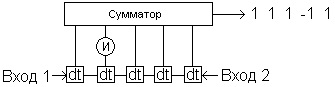 Здесь используются пять задержек на некоторый фиксированный интервал времени dt, задающие требуемую частоту импульсов, инвертор "И", меняющий знак сигнала на своем входе, и сумматор. Если на Вход 1 подать импульс, то на выходе сумматора образуется нужная последовательность из пятерки положительных и отрицательных единиц. Сигнал, образованный на выходе сумматора, отправляется в сторону предполагаемой цели, отражается от нее и возвращается уже на Вход 2 этой же схемы. По результатам суммирования импульсов отраженного сигнала на выходе сумматора образуется следующая цифровая последовательность: 1,0,1,0,5,0,1,0,1. Обратите внимание на тот факт, что центральный суммарный импульс в 5 раз превышает амплитуду остальных импульсов, отраженных от цели. По сути дела, это – функция автокорреляции радиолокационного сигнала. Однако отраженный сигнал возвращается на приемник локатора с неизбежными шумами, и его амплитуда может оказаться ниже уровня шума. Известно, что n-кратное суммирование белого шума увеличивает его амплитуду в √n раз. Поэтому при использовании кода Баркера с достаточно большим n сигнал от реальной цели можно было бы четко выделить на фоне шумовых помех. Дело было за малым – заказчика интересовал код Баркера для n=30.
